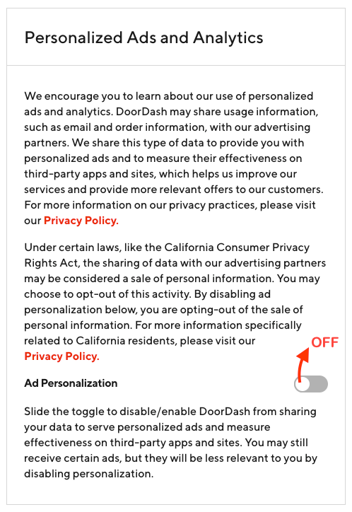 Under the right to opt-out of sale or sharing of personal information, you have the right to opt-out of having your personal information sold or shared (as the terms “sold” and “shared” are defined under applicable data protection and privacy laws), or used for purposes of targeted advertising. You may still receive certain ads, but they will be less relevant to you by disabling personalization. To opt-out of the sale or sharing of personal information and targeted advertising, please use the “Do Not Sell or Share My Personal Information” link the DoorDash or Caviar homepage. Alternatively, go directly to www.doordash.com/consumer/personalize or www.trycaviar.com/consumer/personalize.