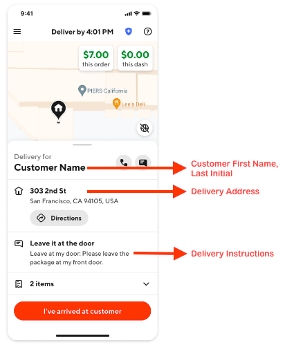 Dashers can only see information related to the order they are delivering, they do not have access to consumers’ personal information, except for what is necessary for them to fulfill the delivery (i.e., the address for the delivery, first name and last initial to confirm identity while picking up and dropping off the order, and any delivery instructions). A Dasher will also see a masked telephone number they can use to reach you.