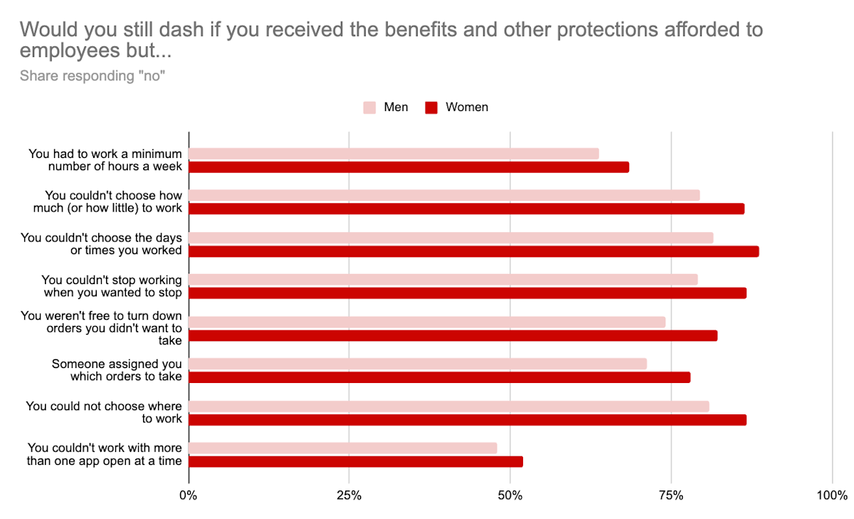 De hecho, cuando preguntamos si los encuestados seguirían haciendo dashes si se impusieran condiciones similares a las del empleo tradicional (como establecer dónde o cuándo las personas podrían hacer dashes, o si podrían rechazar órdenes), las mujeres contestaron que no en mayor medida que los hombres para cada una de las ocho condiciones sobre las cuales preguntamos (consulta el cuadro a continuación). Por ejemplo, el 87 % de las mujeres afirmó que no haría dashes si recibiera los beneficios y otras protecciones que se otorgan a los empleados, pero no podría dejar de hacer dashes cuando deseara detenerse, en comparación con el 79 % en el caso de los hombres.
